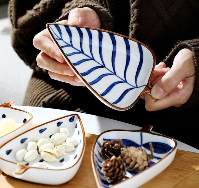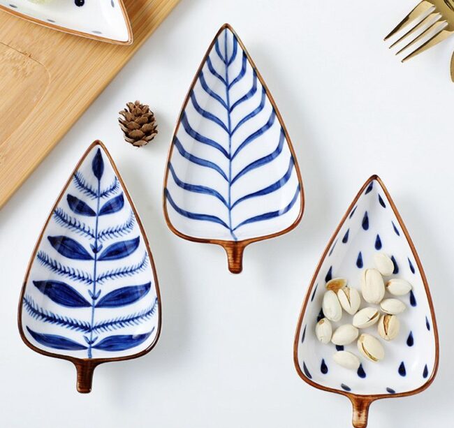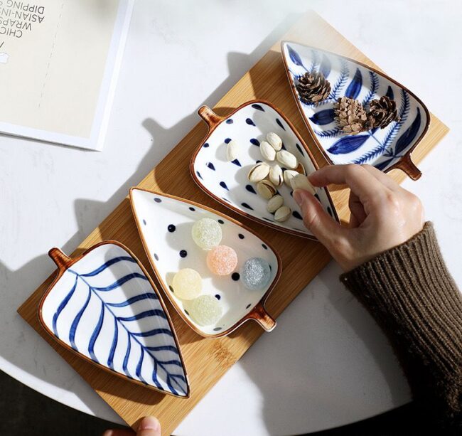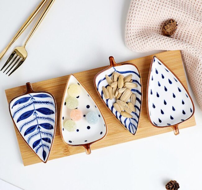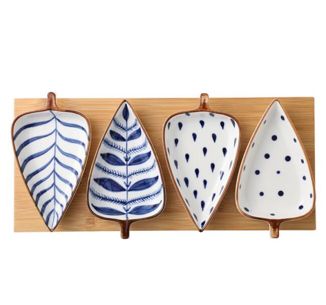 leaf shaped ceramic plates with wooden tray